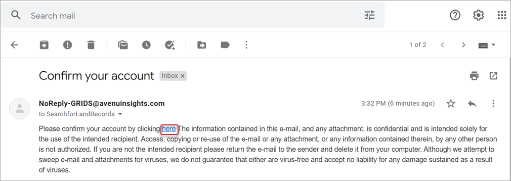 Click the “here” link in the email message to confirm your new account.